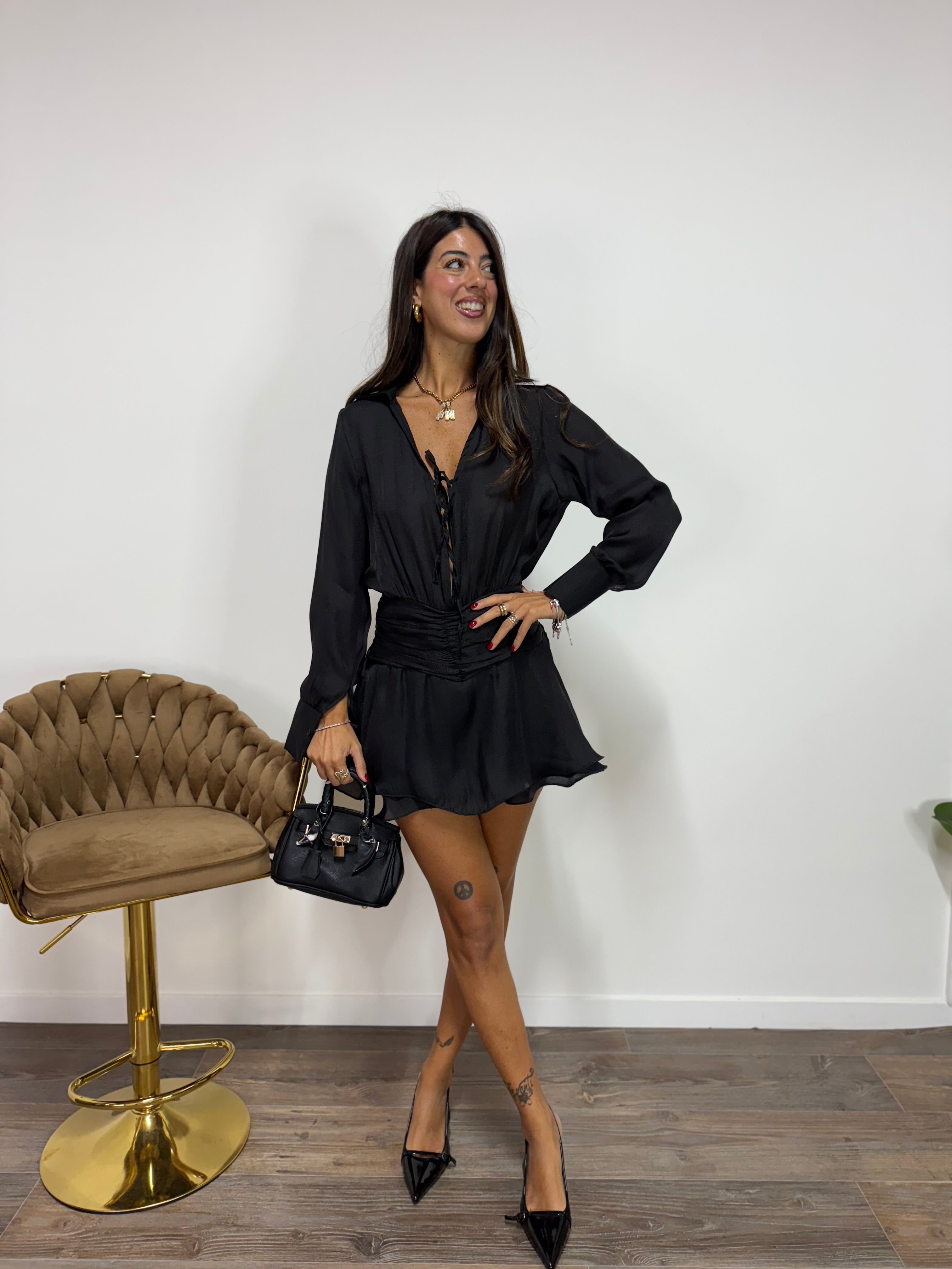 DETTAGLI : Abito in Chiffon a pantalonciono - collo a camicia scollo profondo - Chiusura con laccetto anteriore - Voila sul fondo - Elastico sul retro - Completamente Elasticizzato