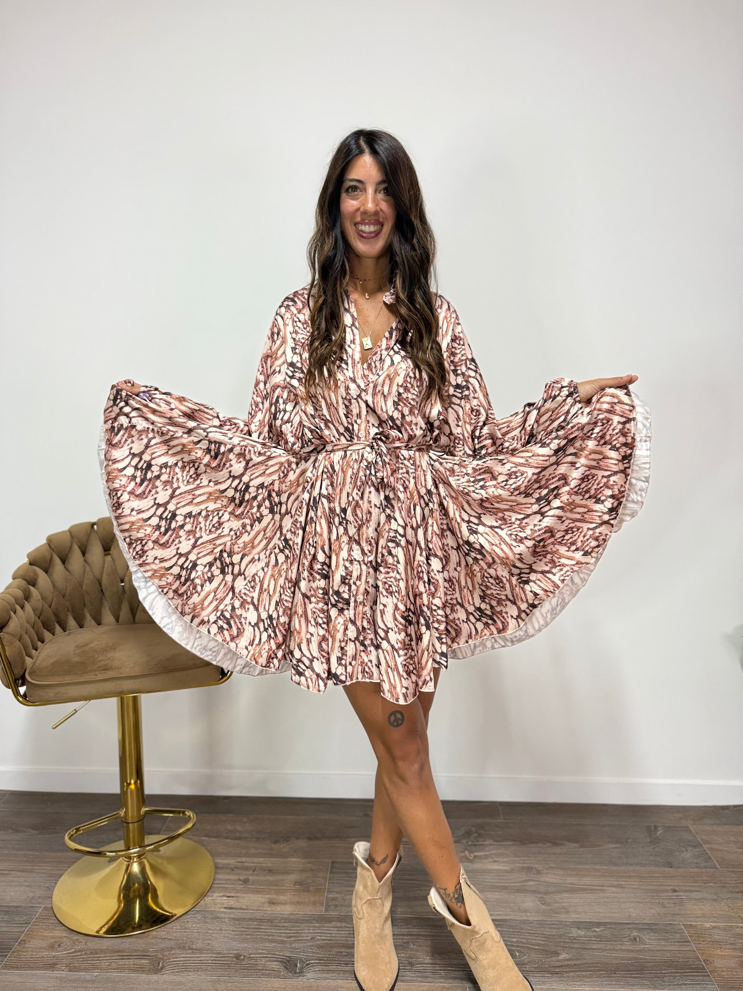 DETTAGLI : Abito collo a camicia in simil seta - Bottonicini su tutta lunghezza - Fusciacca con passanti - Voilà sul fondo - Elastico sulle maniche - Sfumature Oro