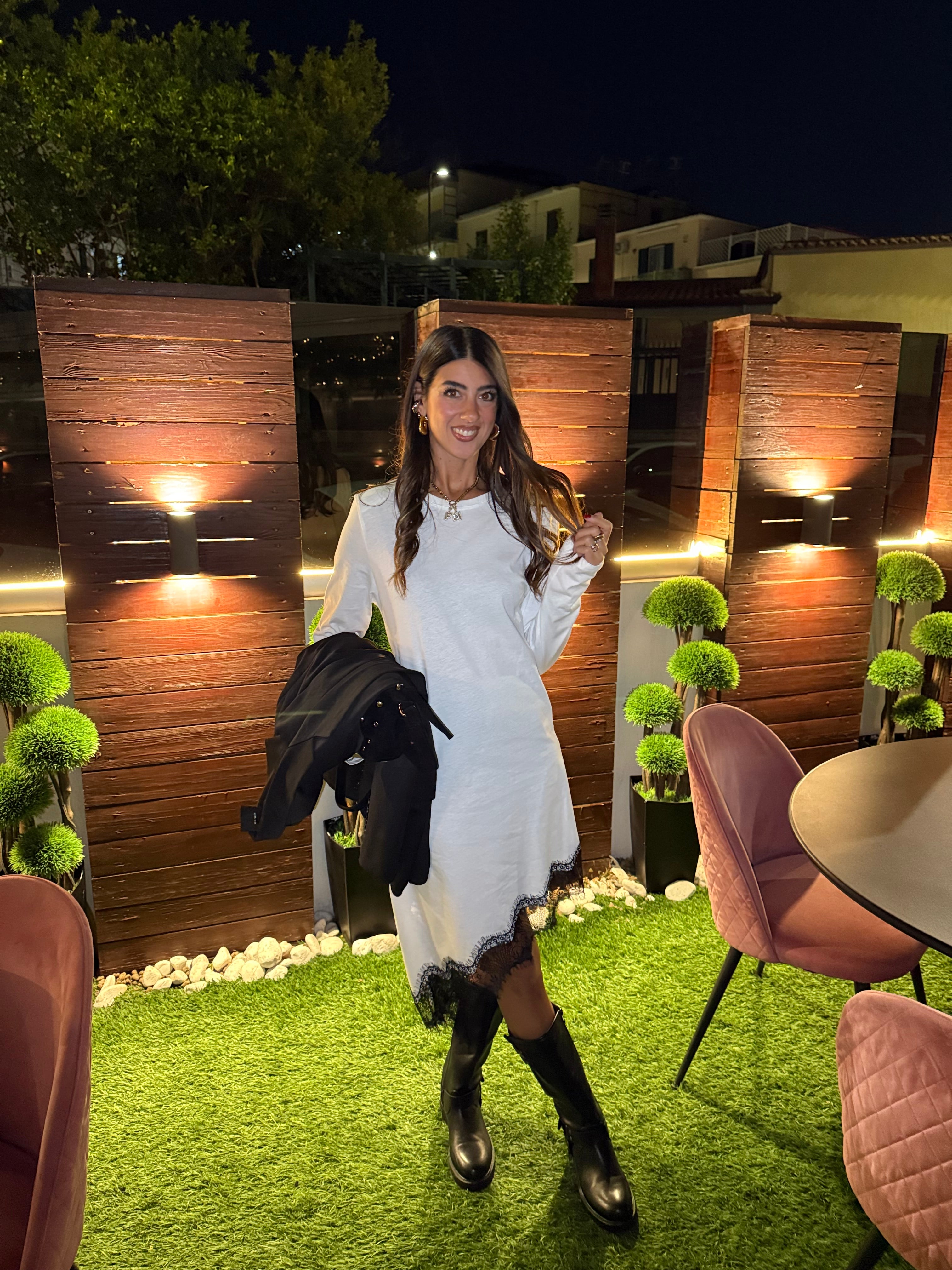 DETTAGLI :Abito in Cotone - Giorocollo Manica lunga - Spalline Imbottite - Asimmetrico con Merletto sul fondo - Leggermente Elasticizzato