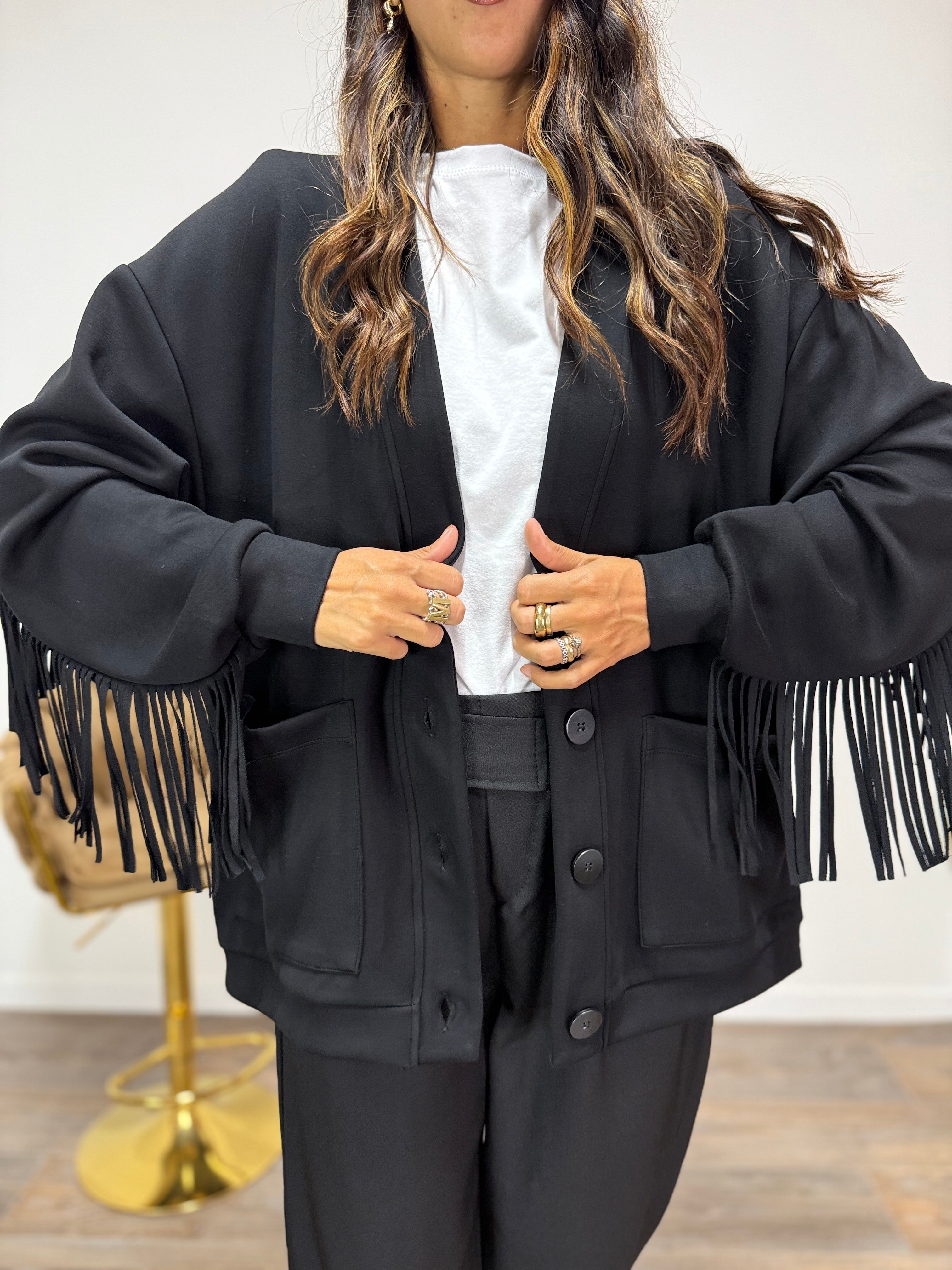 DETTAGLI : Cardigan scollo a V 4 bottoni - Tasche anteriori - Elastico sui polsini e sul fondo - Dettaglio frange sulle maniche e sul retro - Tessuto Morbido
