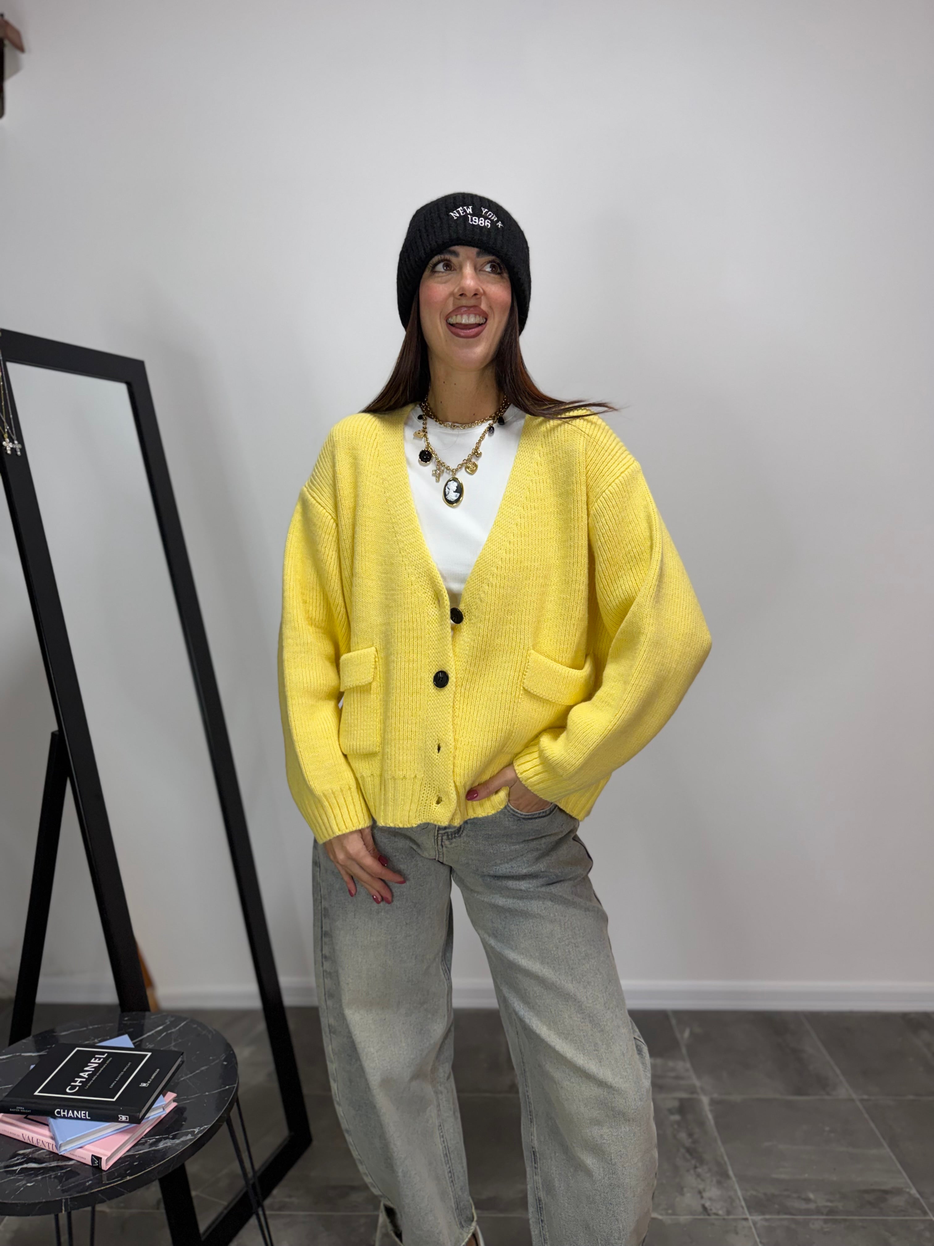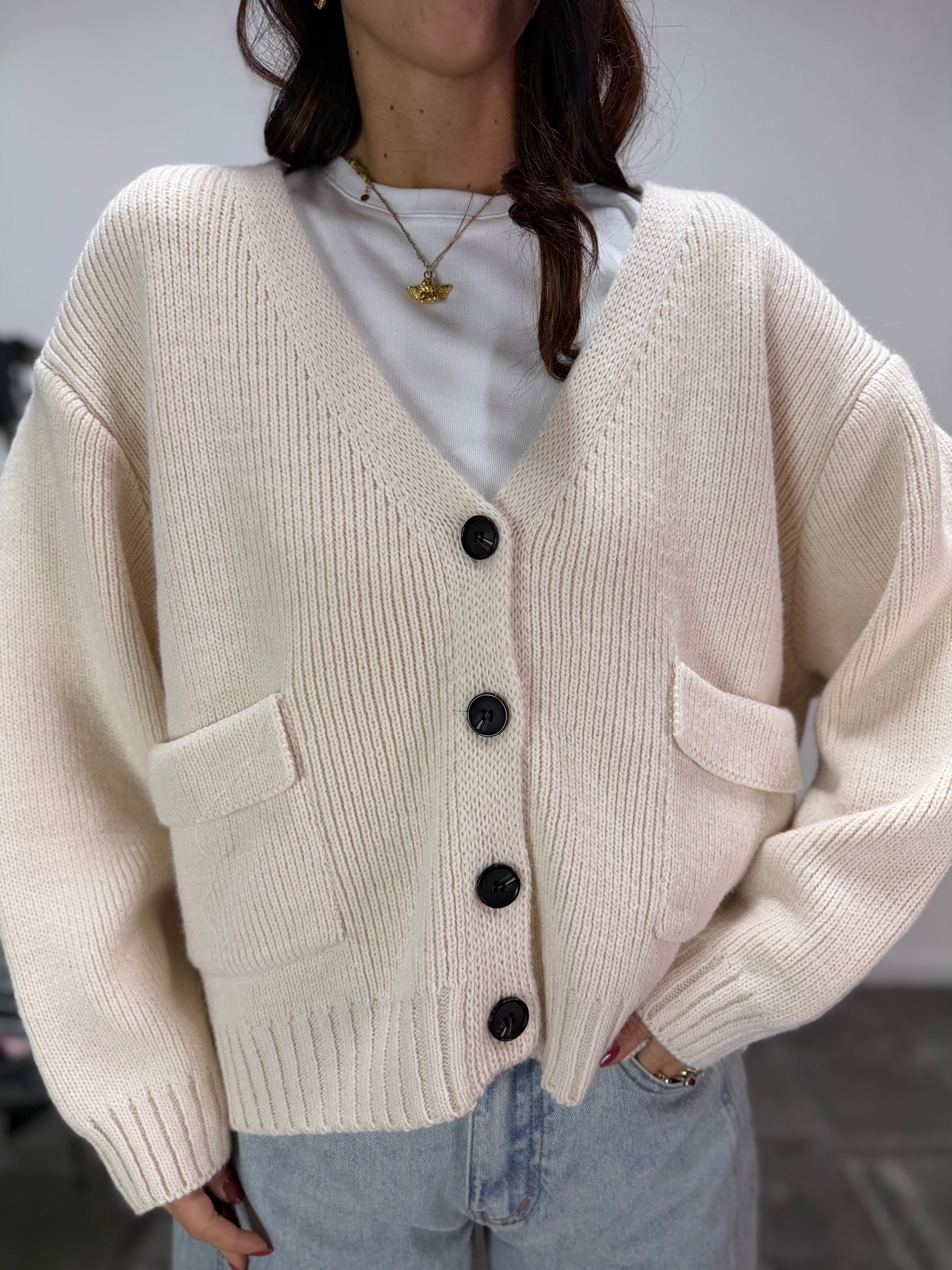 DETTAGLI : Cardigan in lana intreccio - Scollo a V 4 bottoni - Doppia tasca anteriore- Morbido