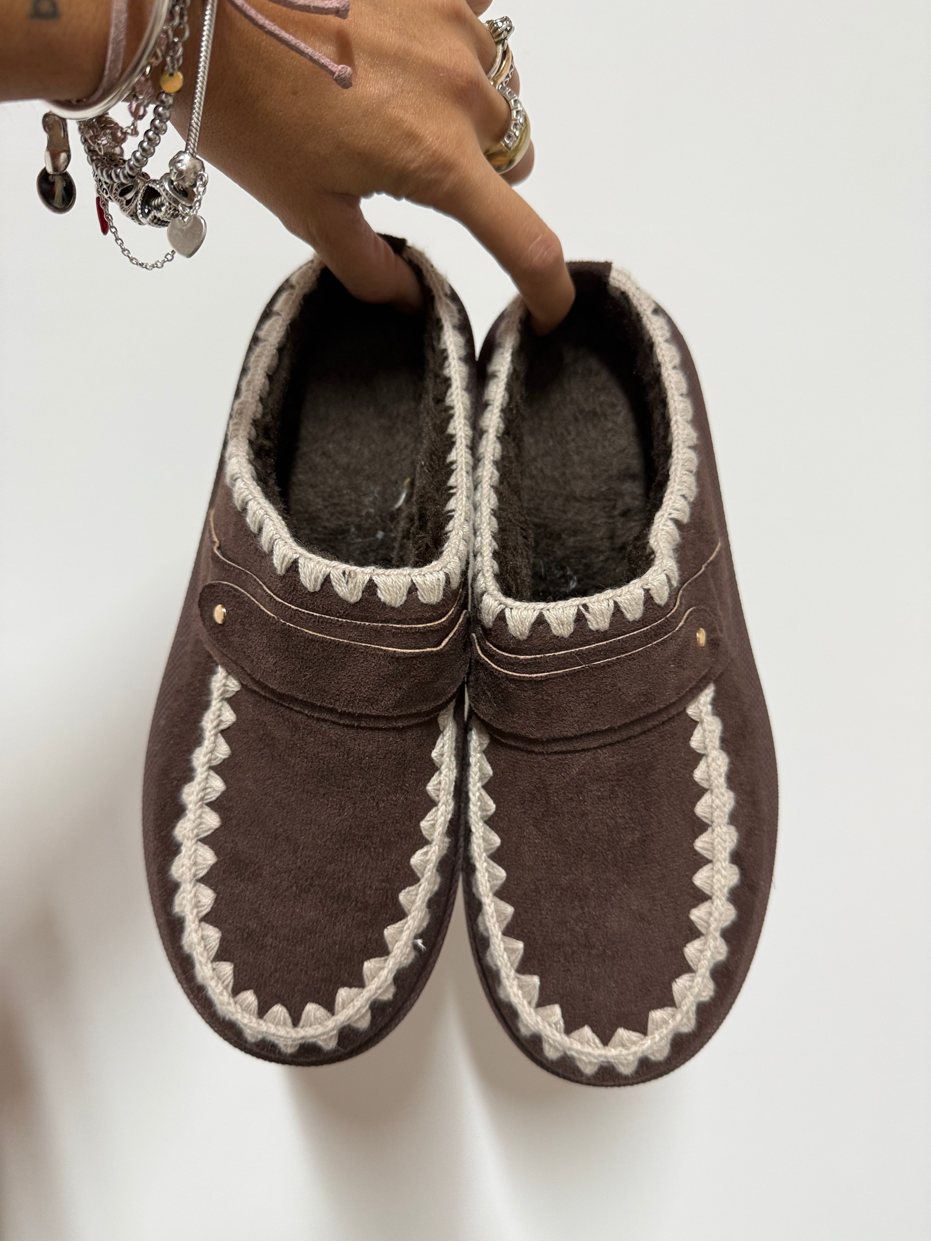 DETTAGLI :Ciabbatta in camoscio modello UGG - Peluche interno morbito - Ricamo in cotone sulla parte superiore e sulla collo - finta fibbia- suoletta in gomma