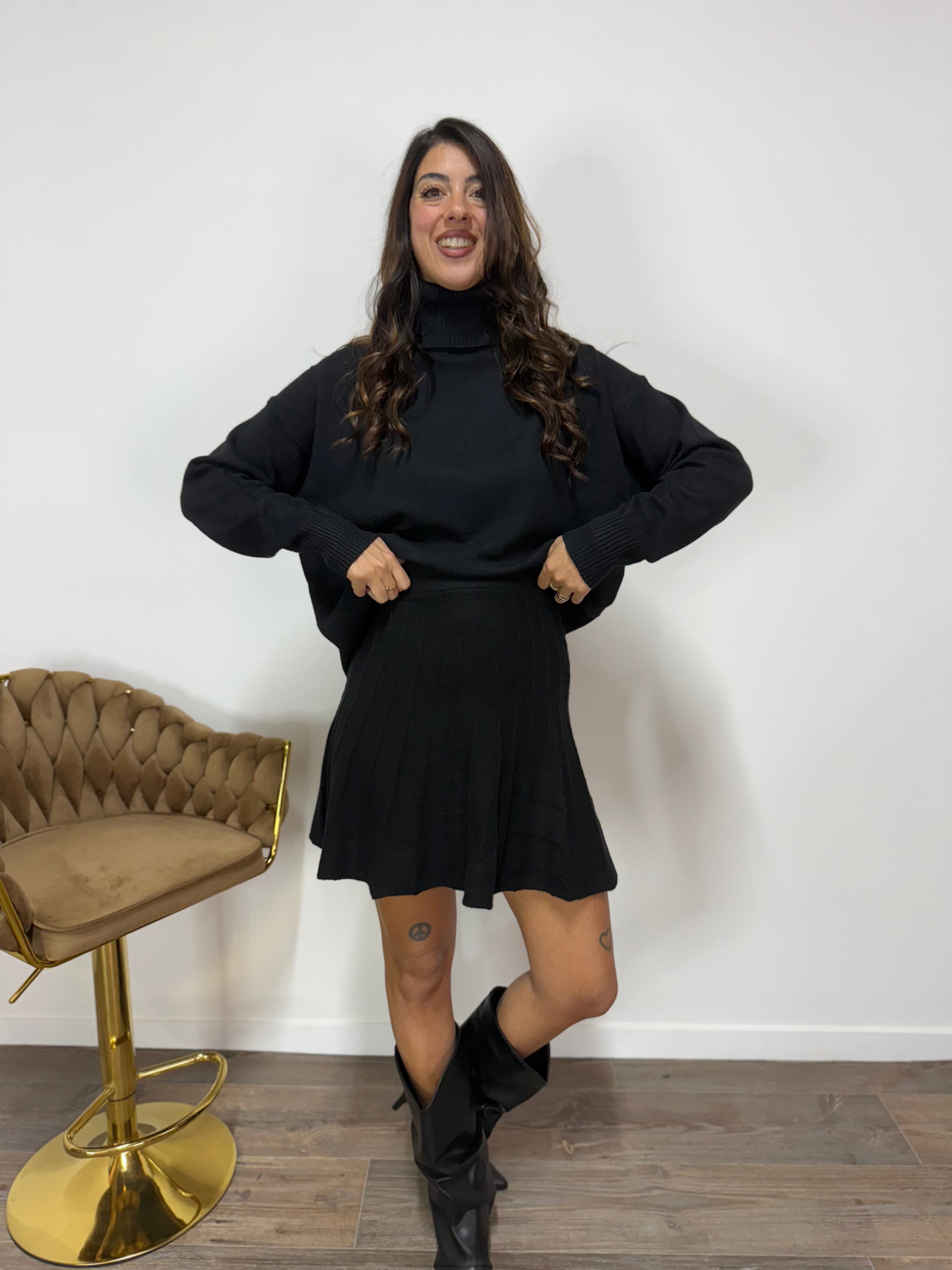 DETTAGLI :Coordinato in viscosa - Gonna plisse con elastico su tutto il girovita - Pull collo alto - Elastico sul fondo e sui polsini -