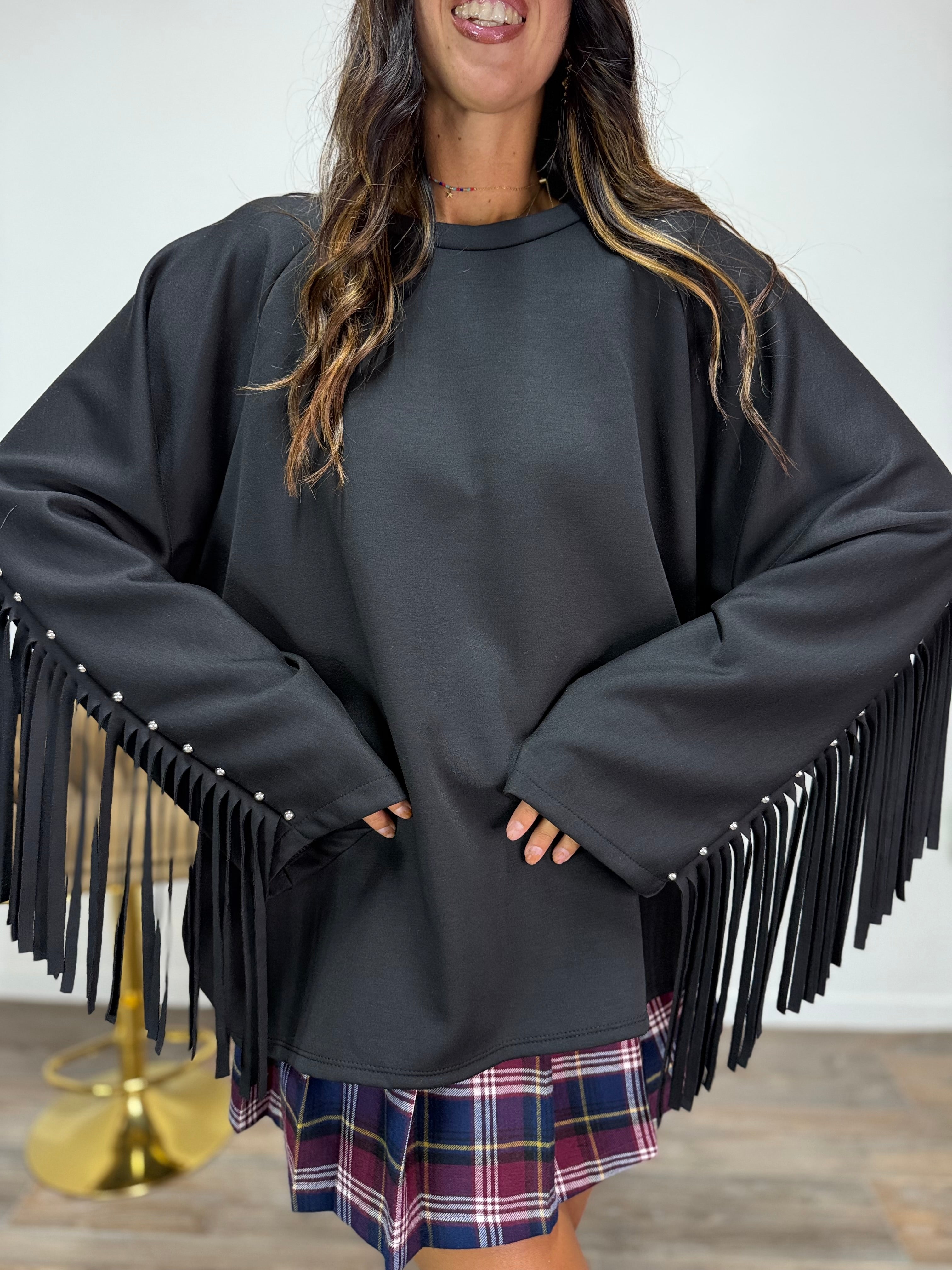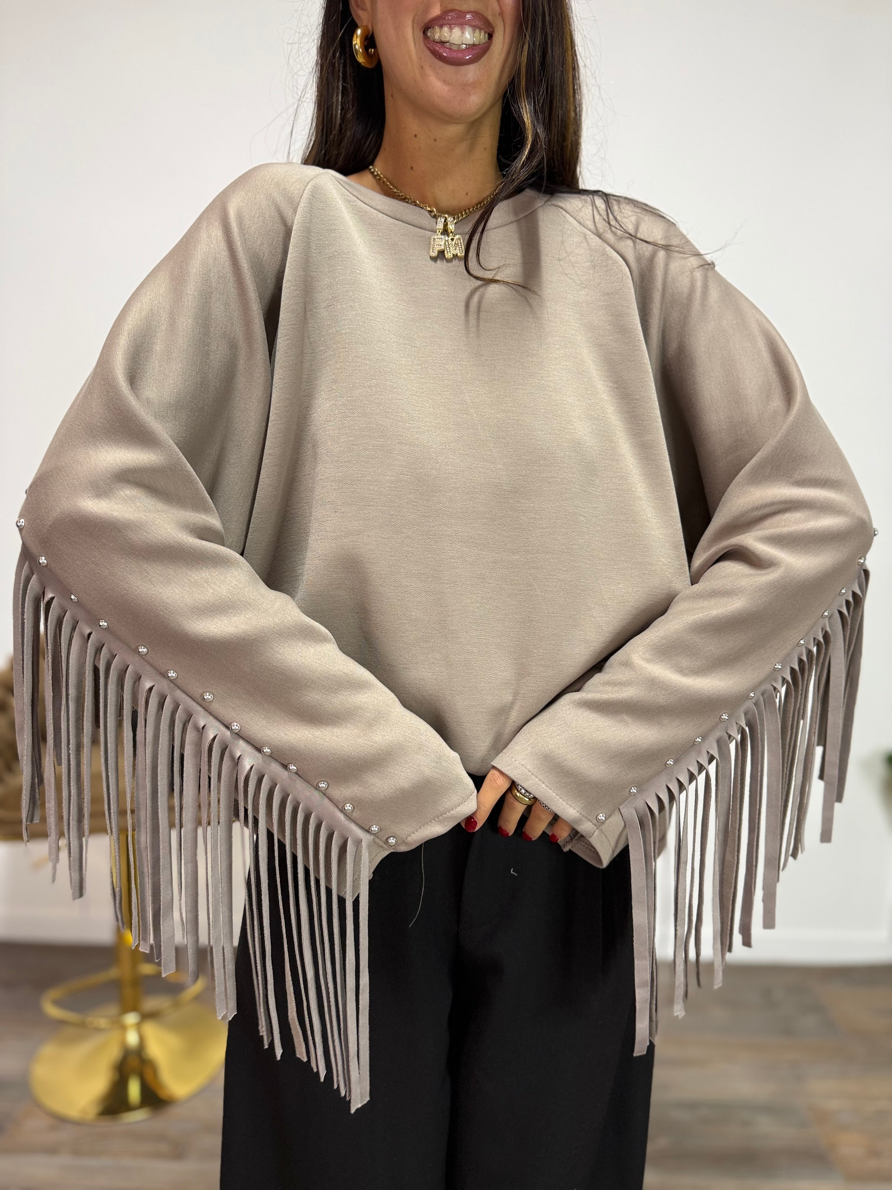 DETTAGLI: Maxy Felpa girocolo in Viscosa - Dettaglio Frange e Borchie sulle maniche e sulla parte posteriore