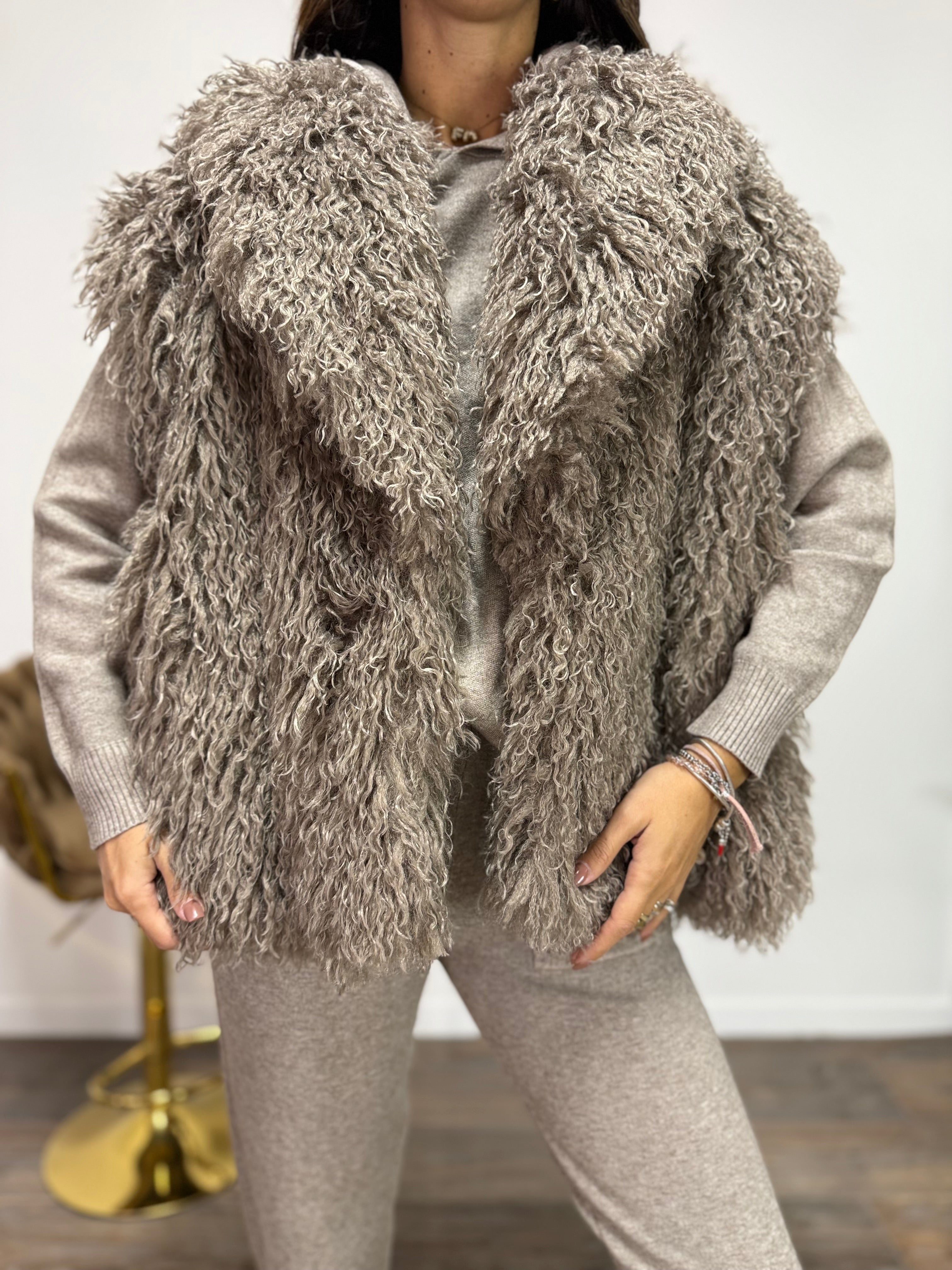 DETTAGLI :Eco Pelliccia Mongolia Giromanica - super morbida - Chiusura con goncio intreno - Tasche laterali - Fodera interna