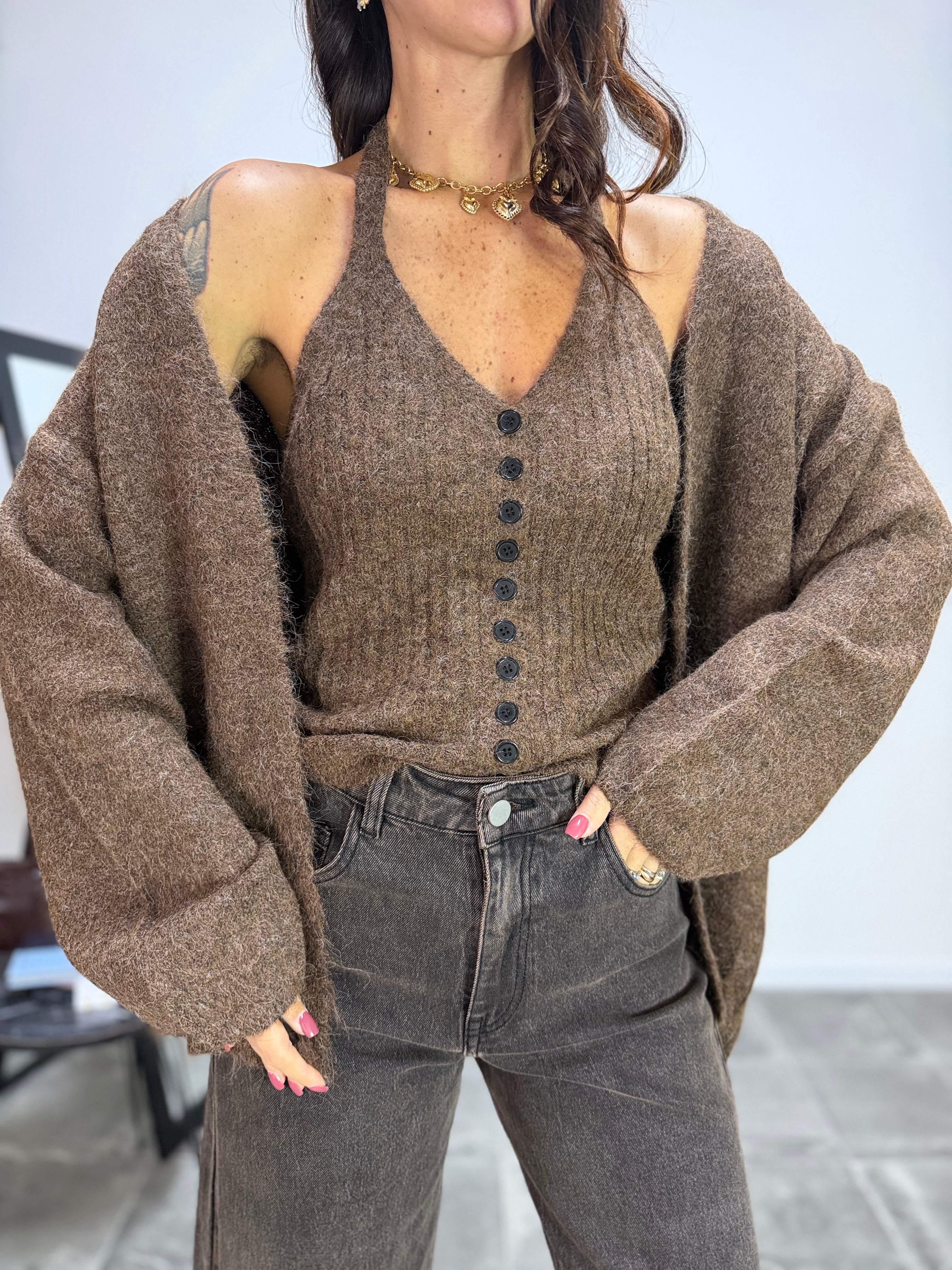 DETTAGLI :Twinset in viscosa composto da Cardigan elastico sul fondo e sui polsini Top con chiusura di 10 bottoncini al collo- Super Morbido